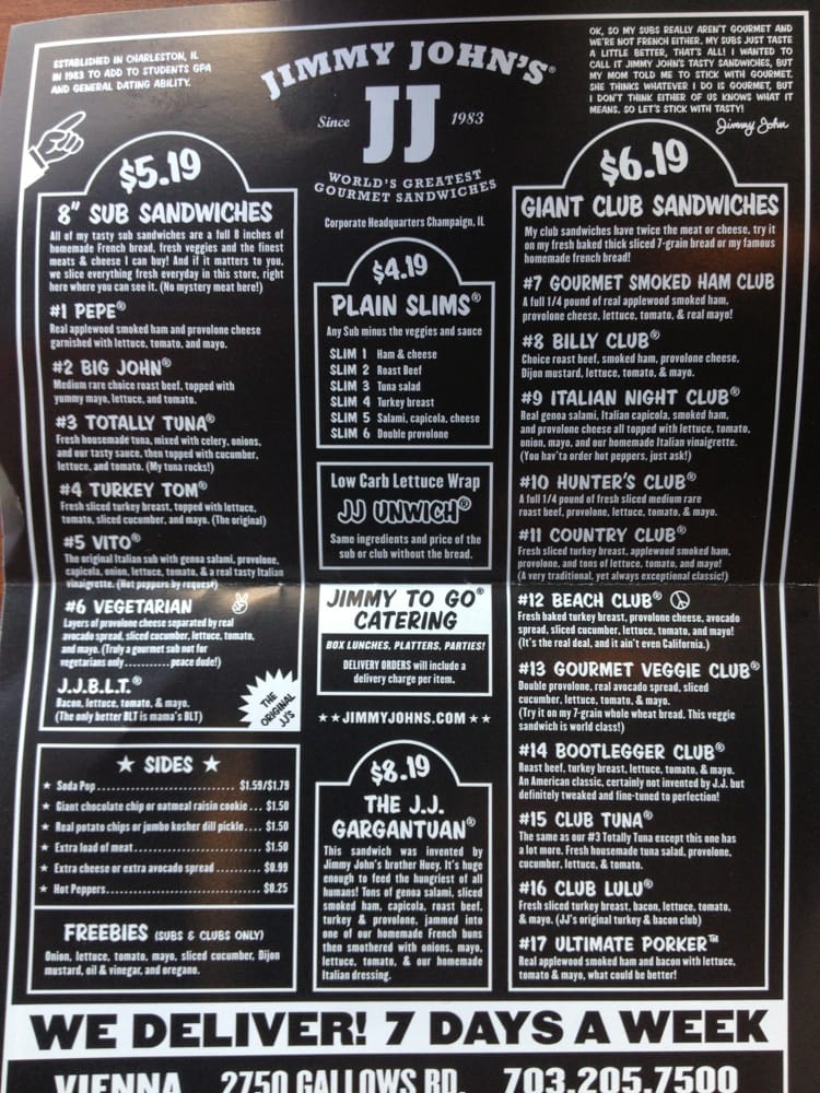 “ I order delivery to my office at least twice a month. They have never been late or gotten my order wrong. The quality is what you expect from Jimmy Johns. ”